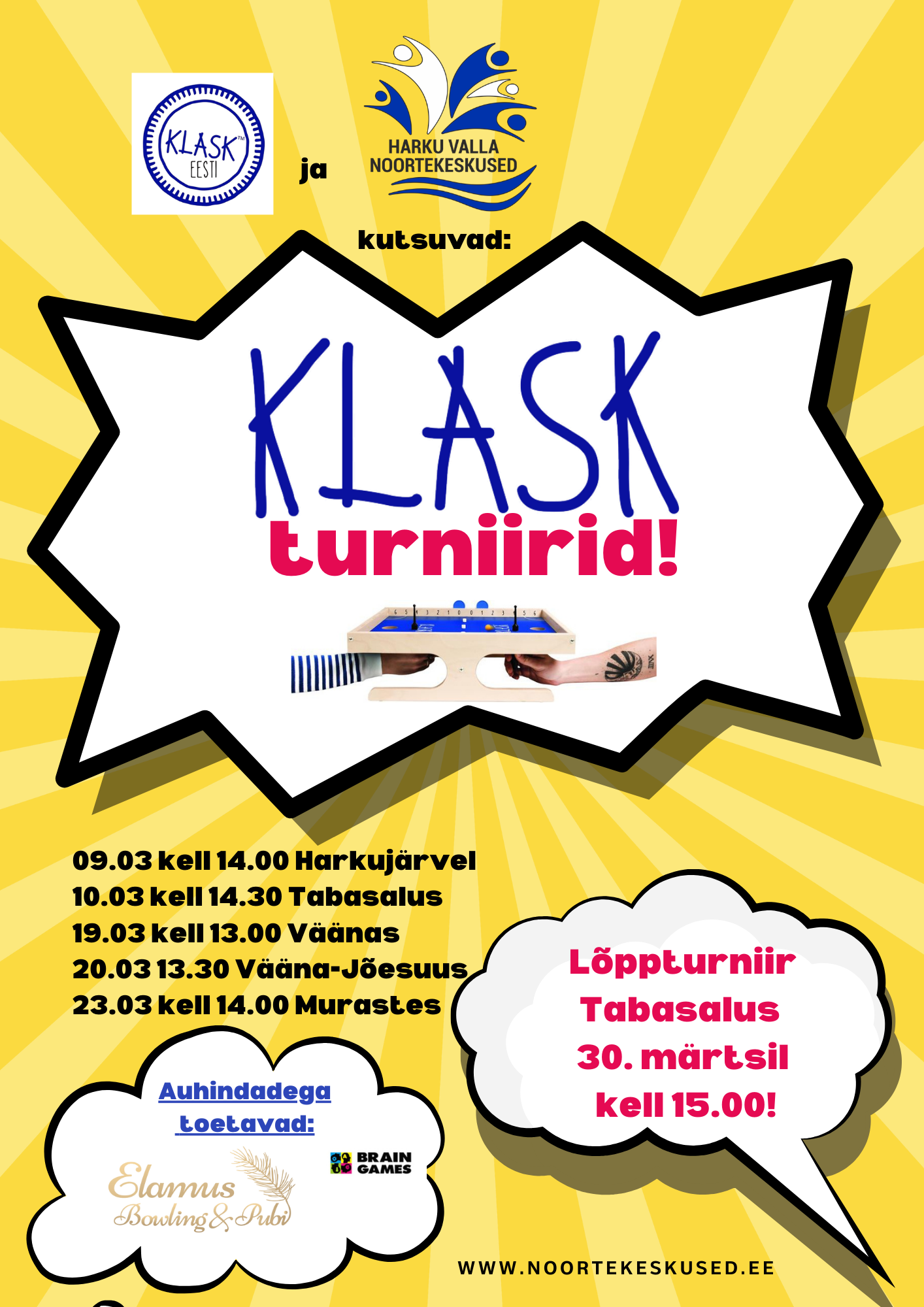 Harkujärve noortekeskus, Muraste noortekeskus, Tabasalu noortekeskus, Vääna noortekeskus, Vääna-Jõesuu noortekeskusKas oled valmis kiireks reaktsiooniks, nutikaks taktikaks ja lõbusaks võistluseks? Tule osalema KLASK turniiridel, kus saad panna proovile oma oskused ning veeta ägedalt aega koos sõpradega!