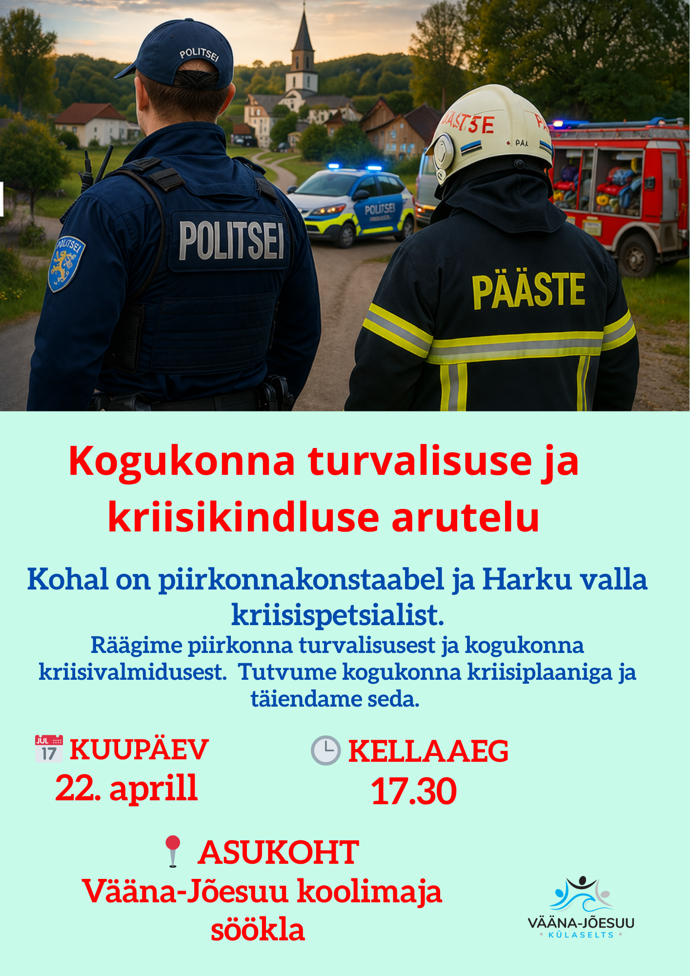 Kohtume 22. aprillil kl 17:30 Vääna-Jõesuu koolimaja sööklas ja arutame koos meie kogukonna turvalisuse ja kriisivalmiduse teemal.