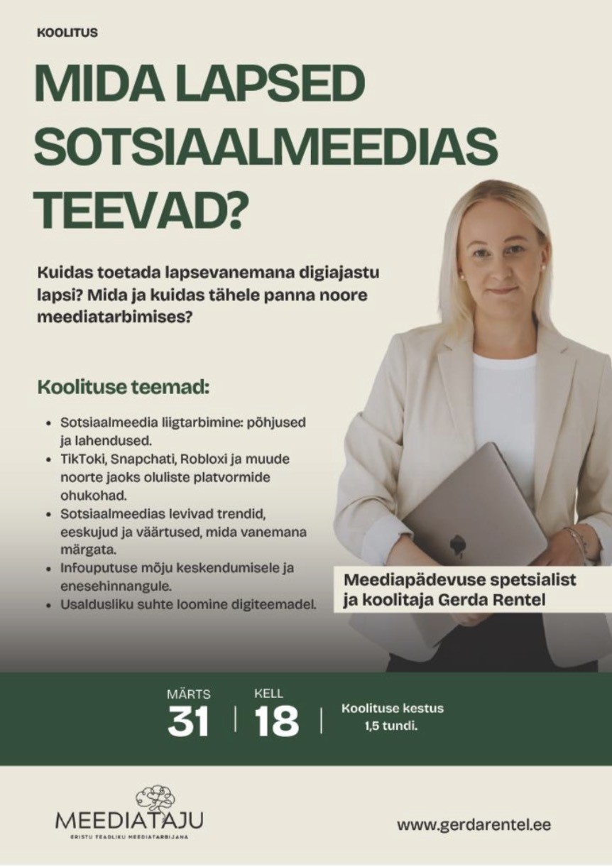 Õhtu jooksul avab laste digimaailma telgitaguseid ning jagab praktilisi teadmisi ja soovitusi meediapädevuse spetsialist ja koolitaja Gerda Rentel.